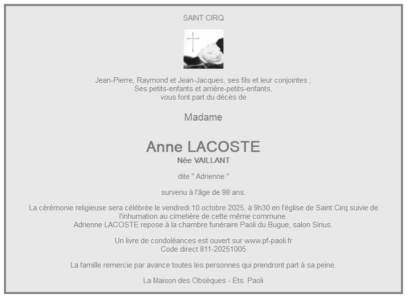 Cet espace « condoléances » est dédié à la mémoire de Madame Anne LACOSTE née VAILLANT.