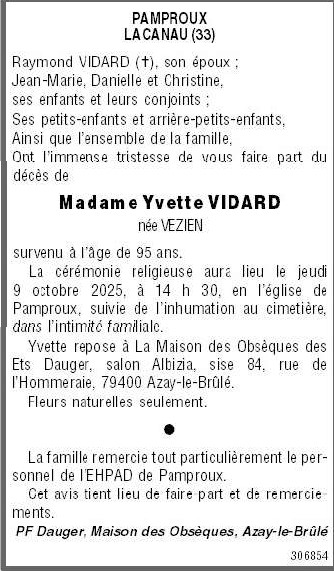 Cet espace « condoléances » est dédié à la mémoire de Madame Yvette VIDARD née VEZIEN.