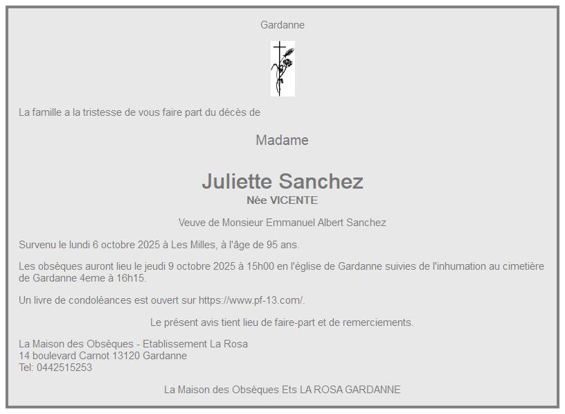 de Madame Juliette Sanchez née VICENTE