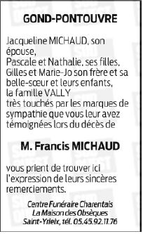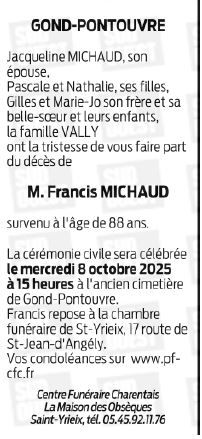 Cet espace « condoléances » est dédié à la mémoire de Monsieur Francis MICHAUD.