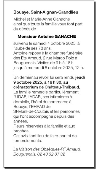 Cet espace « condoléances » est dédié à la mémoire de Monsieur Antoine GANACHE.