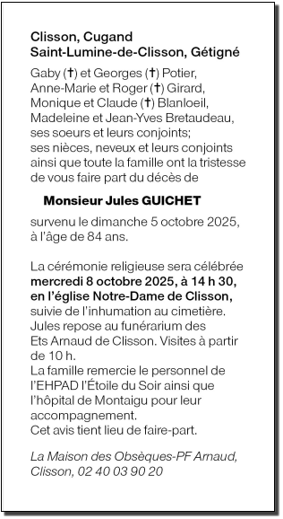Cet espace « condoléances » est dédié à la mémoire de Monsieur Jules GUICHET.