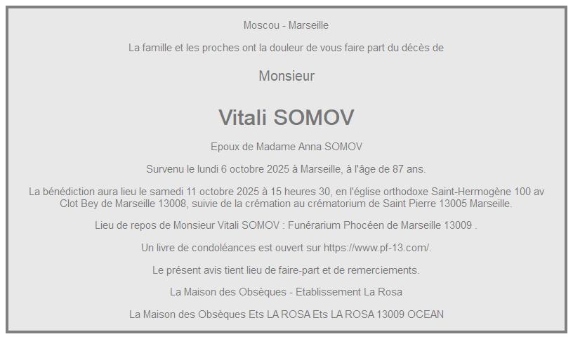 Cet espace « condoléances » est dédié à la mémoire de Monsieur Vitali SOMOV.