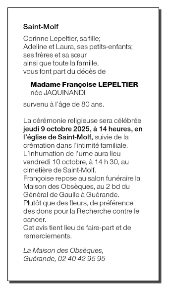 de Madame Rolande LEPELTIER née JAQUINANDI