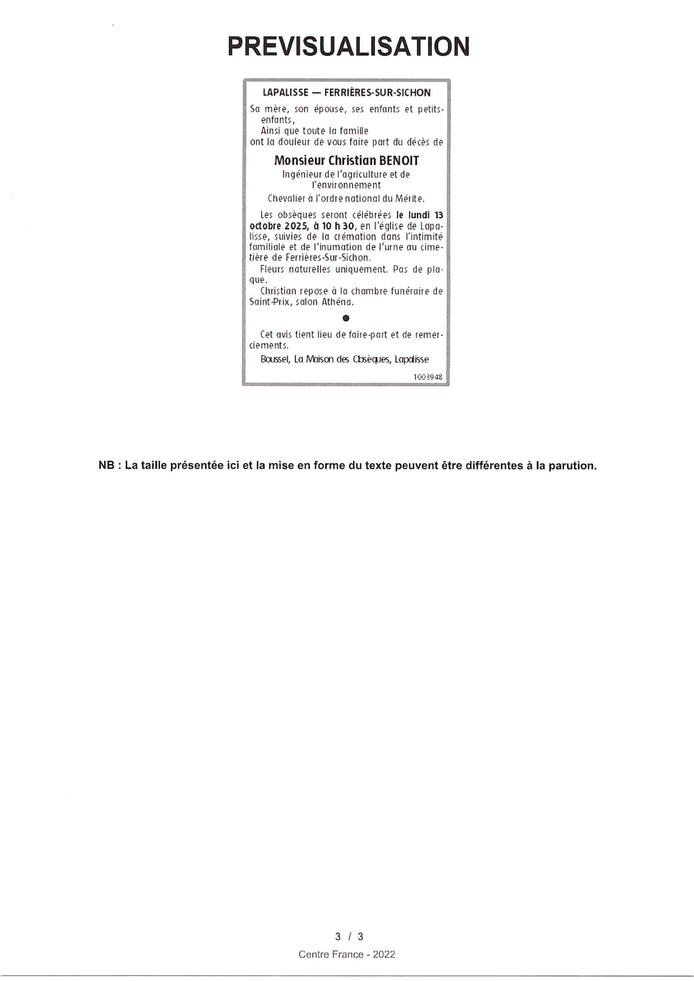 Cet espace « condoléances » est dédié à la mémoire de Monsieur Christian BENOIT.
