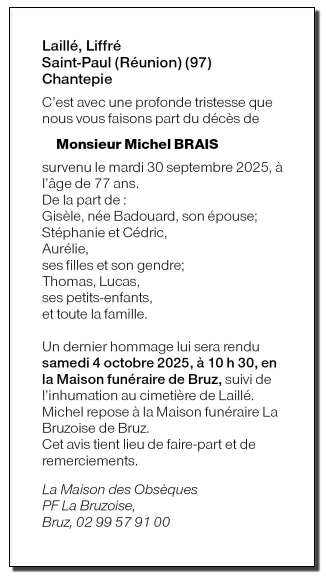 Cet espace « condoléances » est dédié à la mémoire de Monsieur Michel BRAIS.