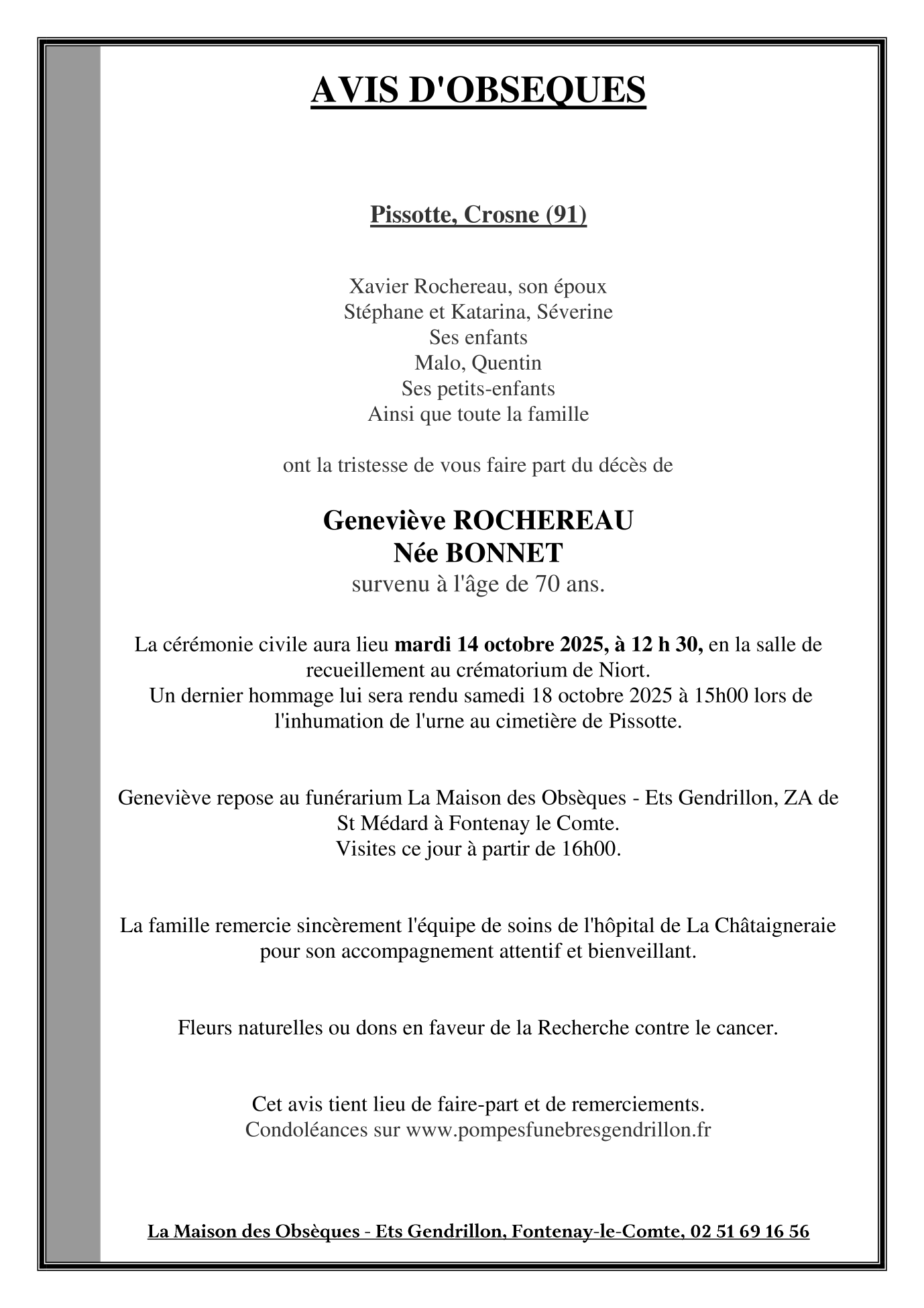 de Madame Geneviève ROCHEREAU née BONNET