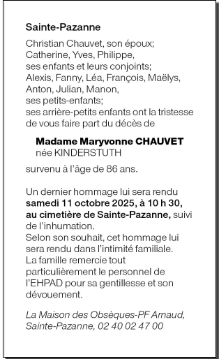 de Madame Maryvonne CHAUVET née KINDERSTUTH