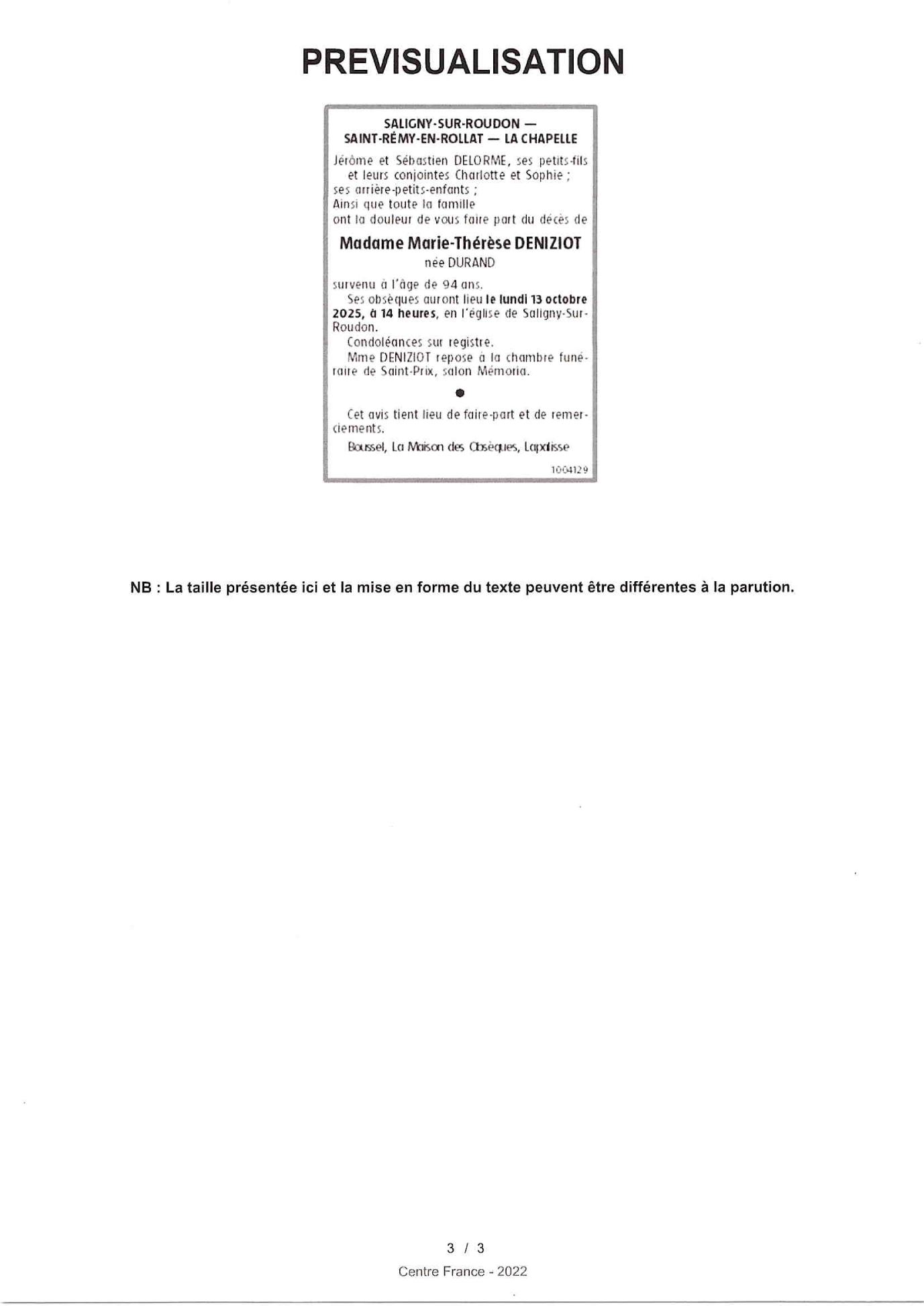 de Madame Marie-Thérèse DENIZIOT née DURAND