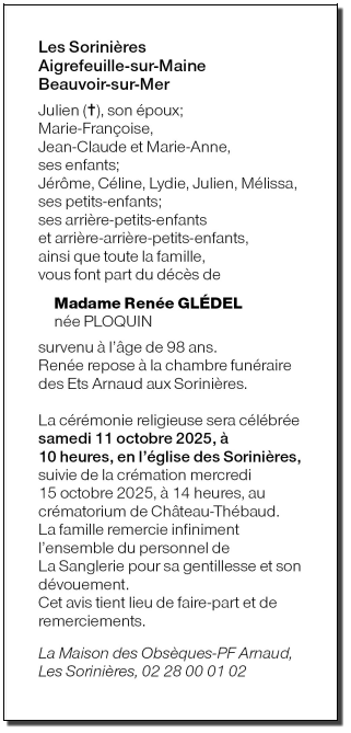 Cet espace « condoléances » est dédié à la mémoire de Madame Renée GLÉDEL née PLOQUIN.