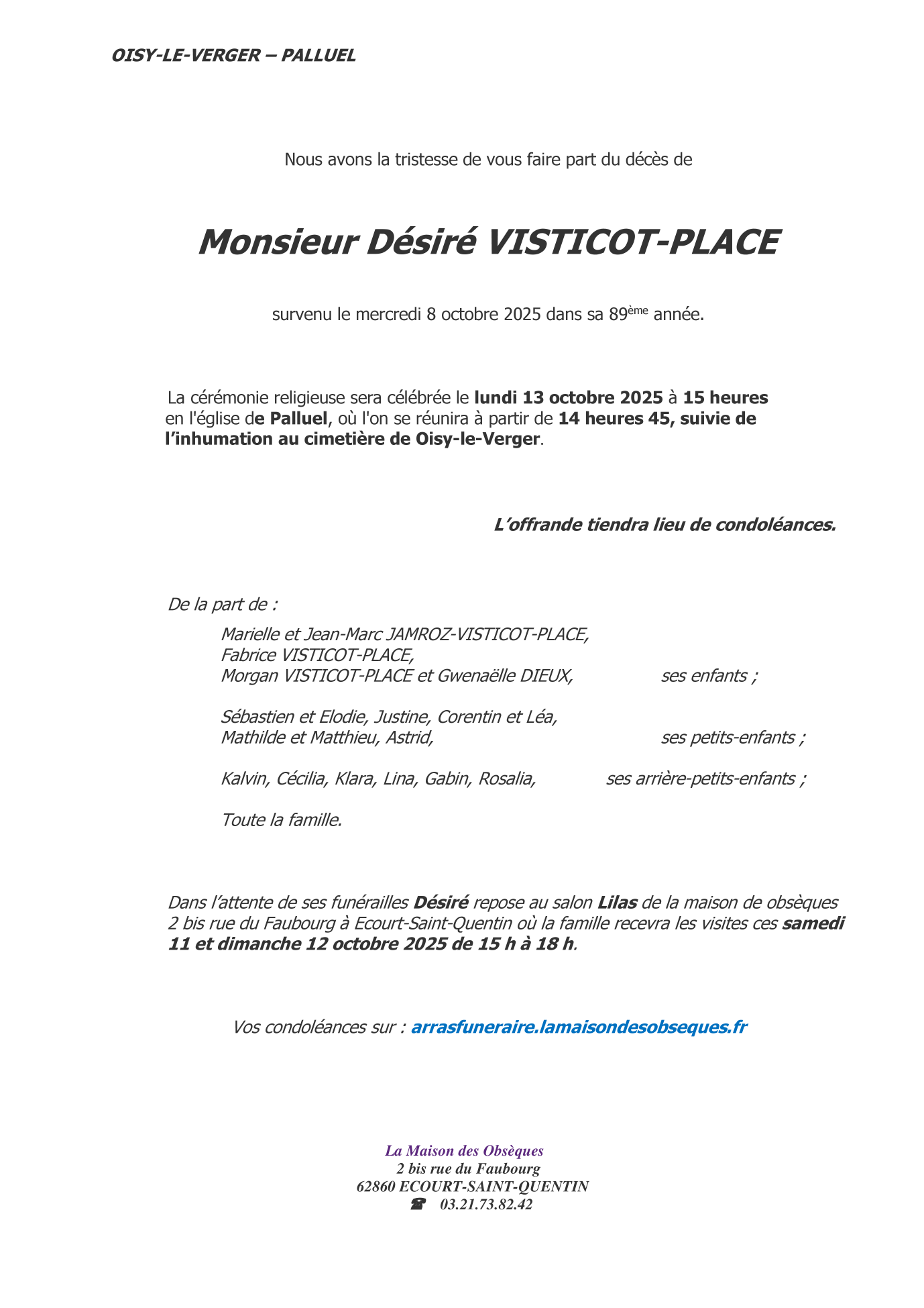 Cet espace « condoléances » est dédié à la mémoire de Monsieur Désiré VISTICOT-PLACE.