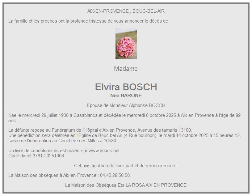 Cet espace « condoléances » est dédié à la mémoire de Madame Elvira BOSCH née BARONE.