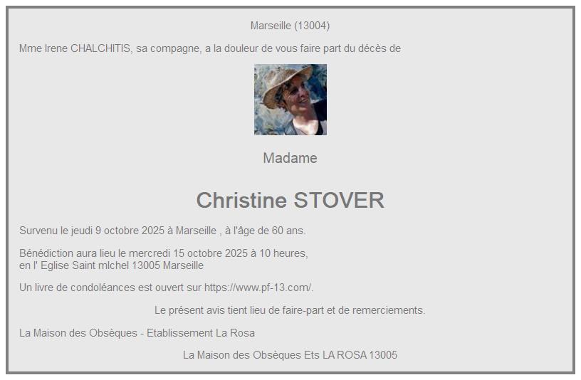 Cet espace « condoléances » est dédié à la mémoire de Madame Christine STOVER.