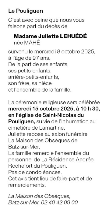 de Madame Juliette LEHUÉDÉ née MAHÉ