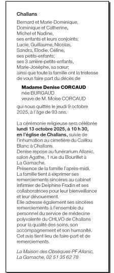 Décédée à Challans (85300) le jeudi 9 octobre 2025