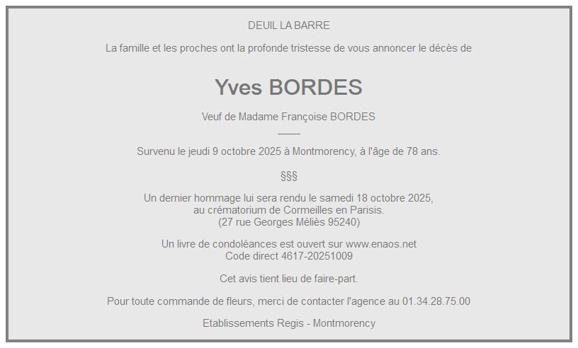 Cet espace « condoléances » est dédié à la mémoire de Monsieur Yves BORDES.