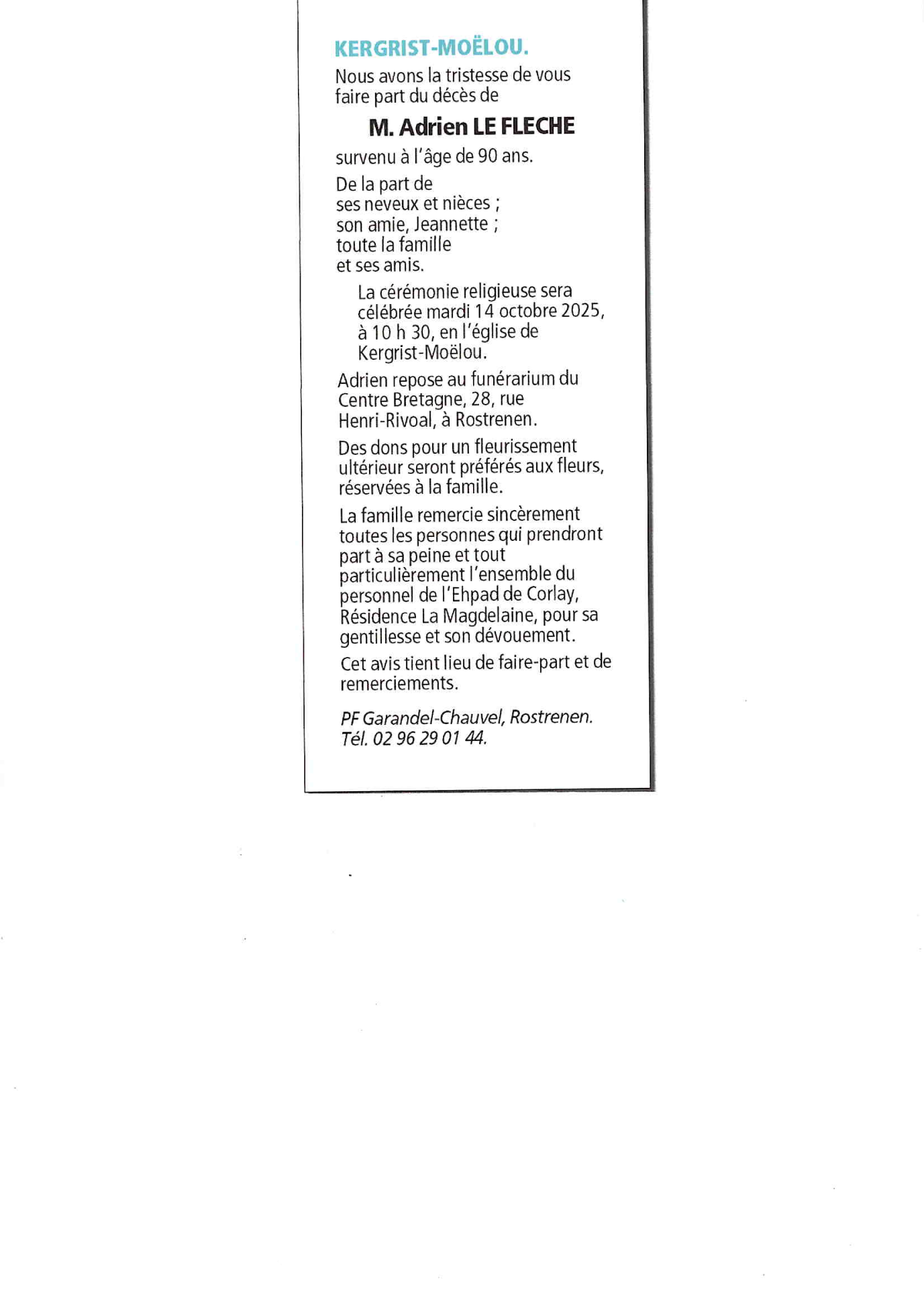 Cet espace « condoléances » est dédié à la mémoire de Monsieur Adrien LE FLECHE.