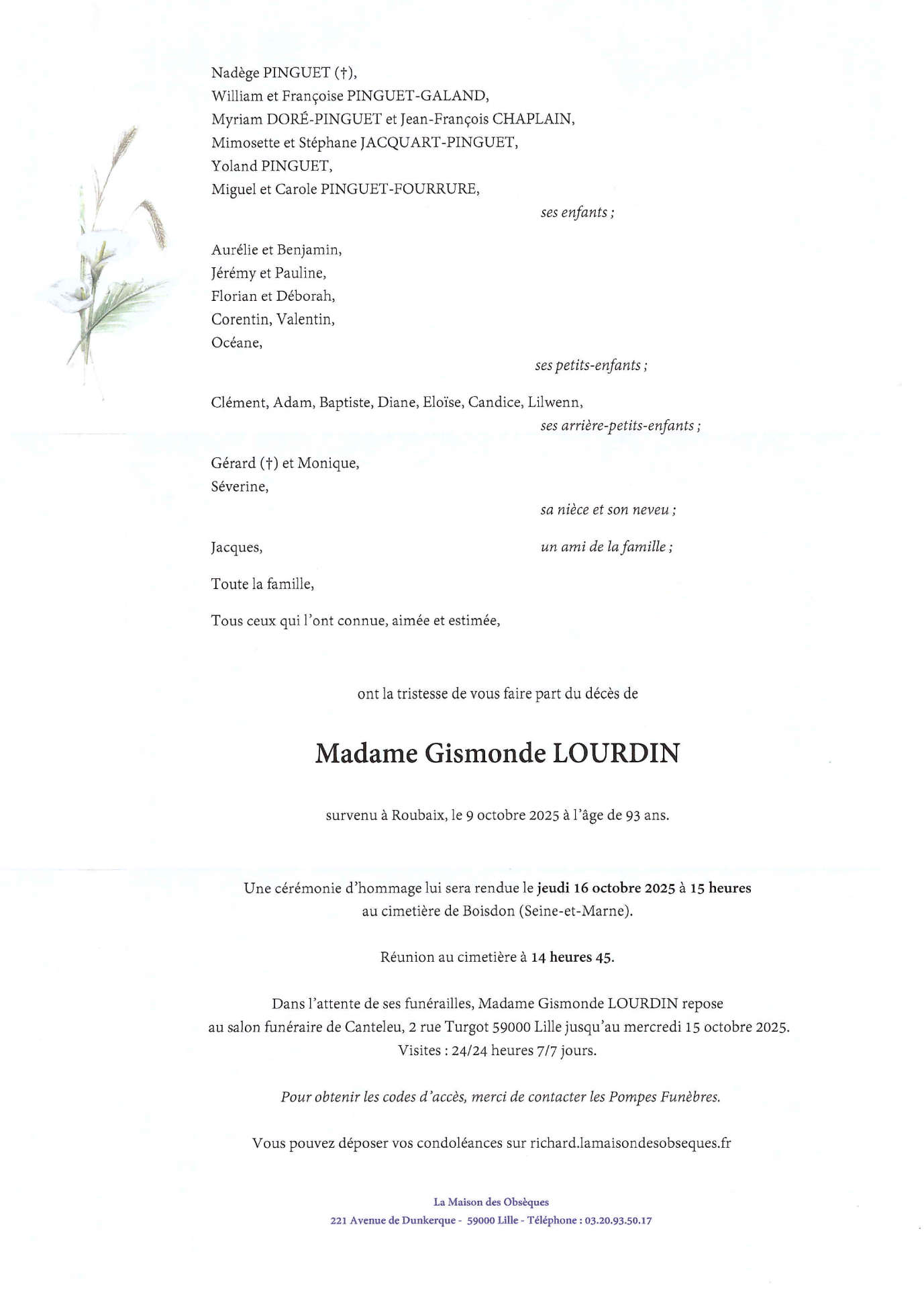Cet espace « condoléances » est dédié à la mémoire de Madame Gismonde LOURDIN.