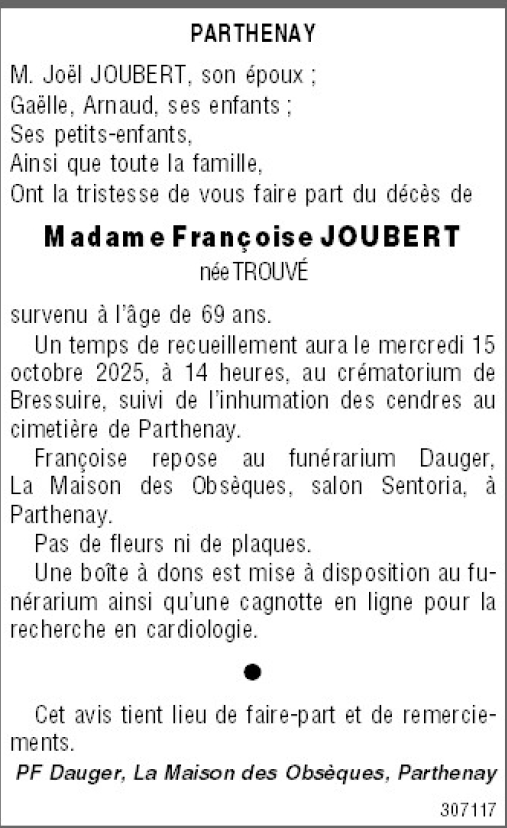 Cet espace « condoléances » est dédié à la mémoire de Madame Françoise JOUBERT née TROUVÉ.