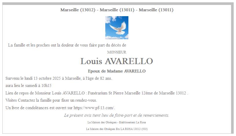 Cet espace « condoléances » est dédié à la mémoire de Monsieur Louis AVARELLO.
