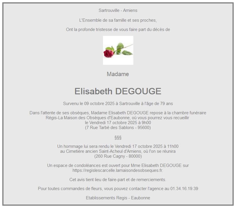 Cet espace « condoléances » est dédié à la mémoire de Madame Elisabeth DEGOUGE.