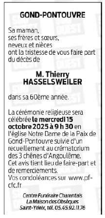 Décédé à La Rochefoucauld (16110) le jeudi 9 octobre 2025