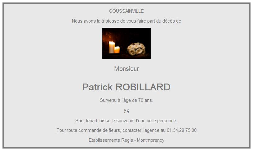 Cet espace « condoléances » est dédié à la mémoire de Monsieur Patrick ROBILLARD.