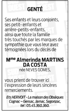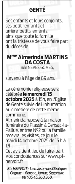 Cet espace « condoléances » est dédié à la mémoire de Madame Almerinda MARTINS DA COSTA née NEVES GOMES.