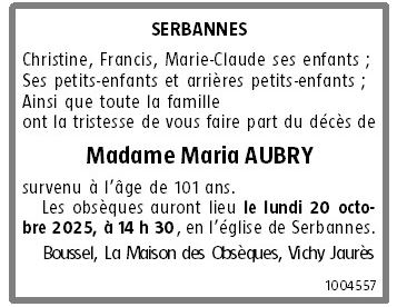 Cet espace « condoléances » est dédié à la mémoire de Madame Maria AUBRY née REICHENBACH.