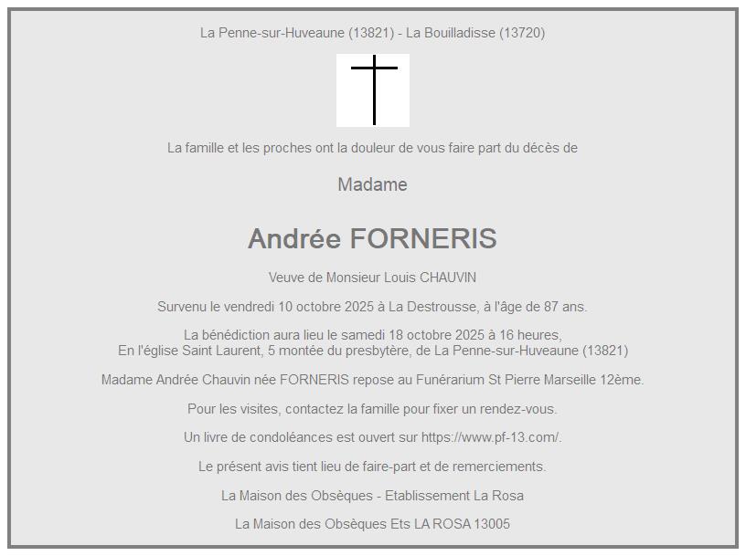 Cet espace « condoléances » est dédié à la mémoire de Madame Andrée FORNERIS.