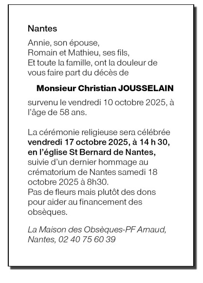Cet espace « condoléances » est dédié à la mémoire de Monsieur Christian JOUSSELAIN.