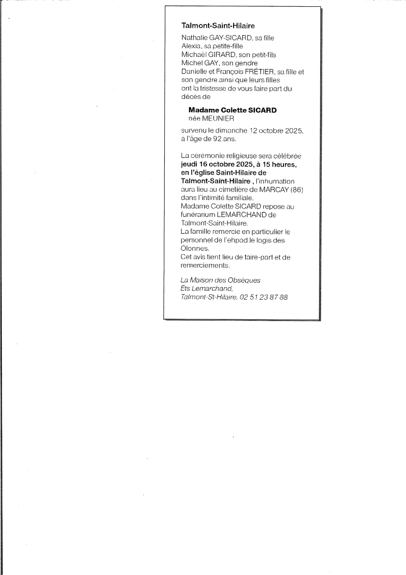 Cet espace « condoléances » est dédié à la mémoire de Madame Colette SICARD née MEUNIER.