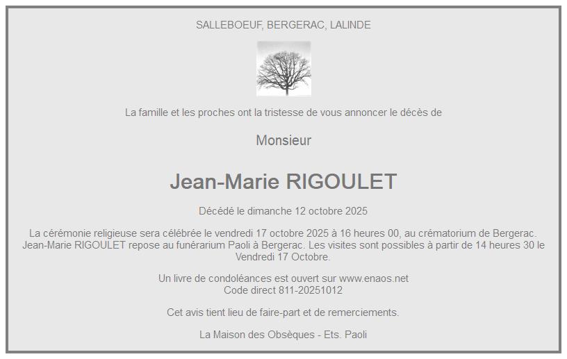 Cet espace « condoléances » est dédié à la mémoire de Monsieur Jean-Marie RIGOULET.