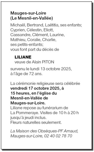 Cet espace « condoléances » est dédié à la mémoire de Madame Liliane PITON née CHARRIER.