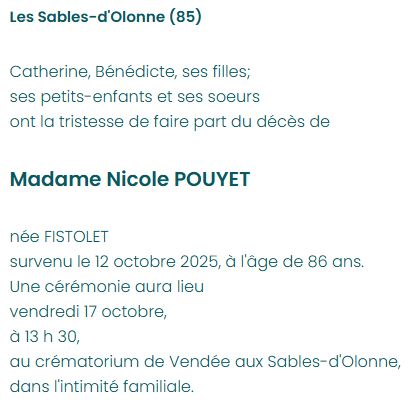 Cet espace « condoléances » est dédié à la mémoire de Madame Nicole POUYET née FISTOLET.
