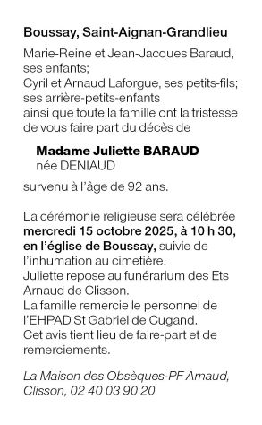Cet espace « condoléances » est dédié à la mémoire de Madame Juliette BARAUD née DENIAUD.