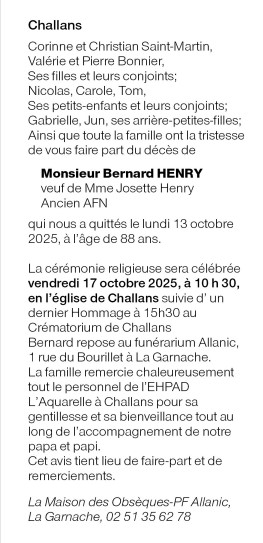 Décédé à Challans (85300) le lundi 13 octobre 2025