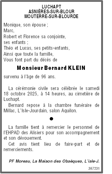Cet espace « condoléances » est dédié à la mémoire de Monsieur Bernard KLEIN.