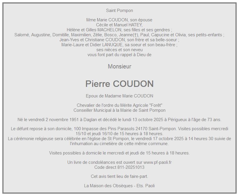 Cet espace « condoléances » est dédié à la mémoire de Monsieur Pierre COUDON.