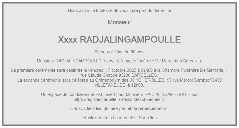 Cet espace « condoléances » est dédié à la mémoire de Monsieur Xxxx RADJALINGAMPOULLE.