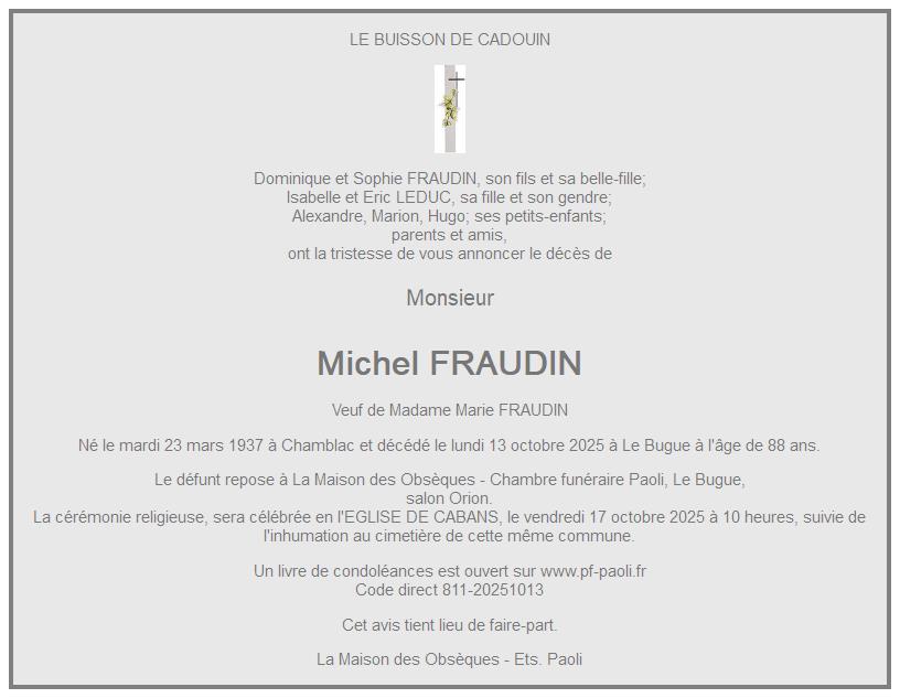 Cet espace « condoléances » est dédié à la mémoire de Monsieur Michel FRAUDIN.