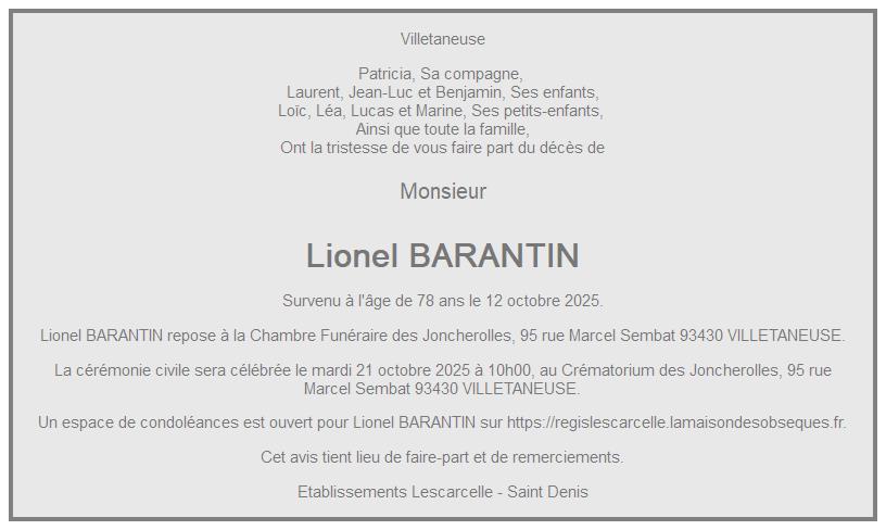 Cet espace « condoléances » est dédié à la mémoire de Monsieur Lionel BARANTIN.