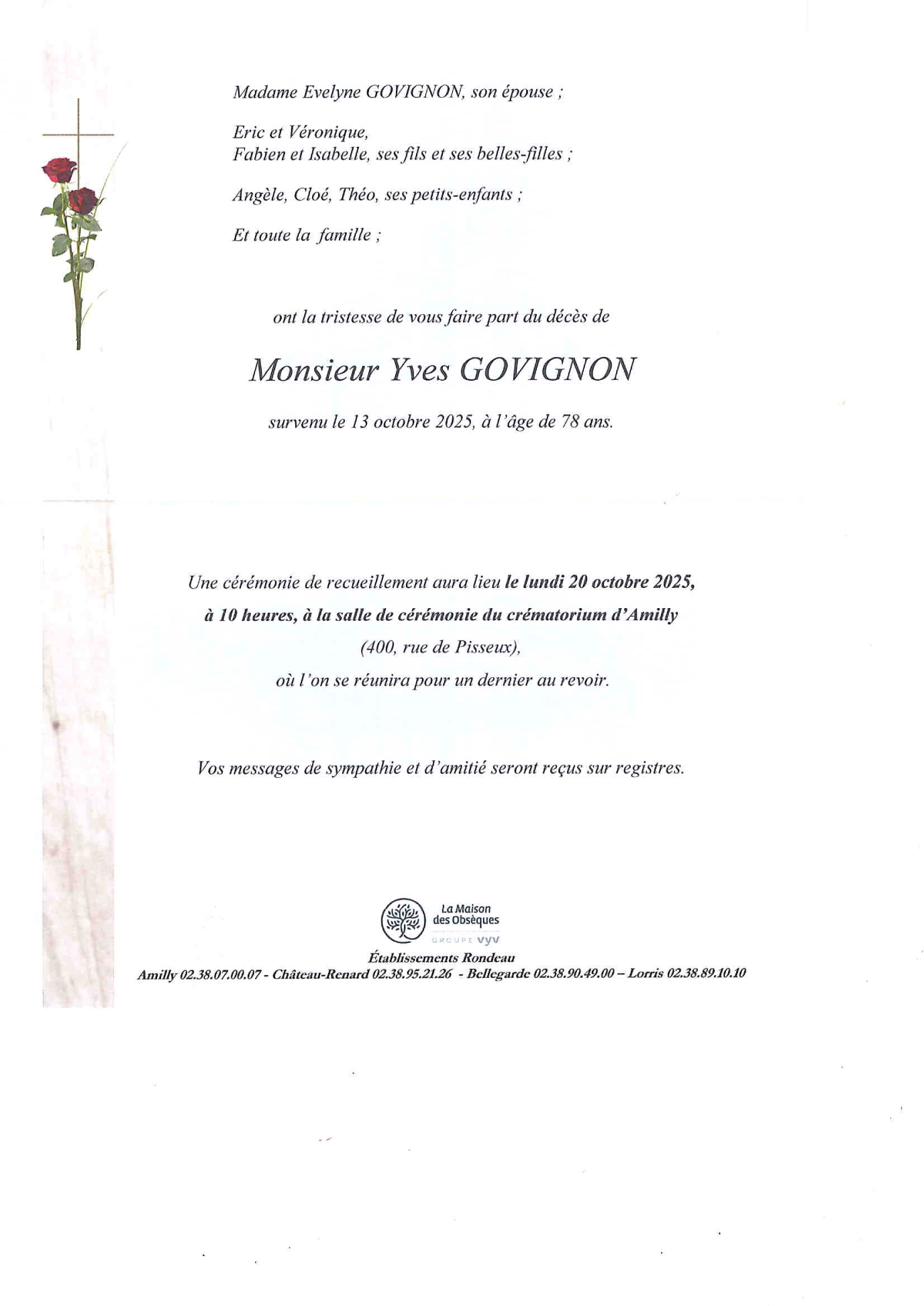 Cet espace « condoléances » est dédié à la mémoire de Monsieur Yves GOVIGNON.