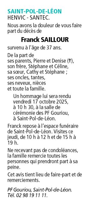 Cet espace « condoléances » est dédié à la mémoire de Monsieur Franck SAILLOUR.