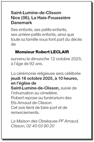 Cet espace « condoléances » est dédié à la mémoire de Monsieur Robert LECLAIR.