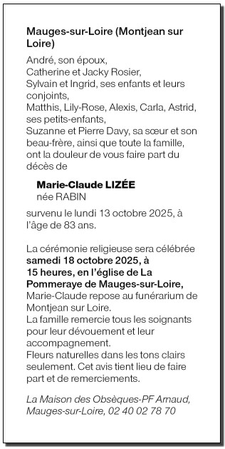 de Madame Marie-Claude LIZÉE née RABIN