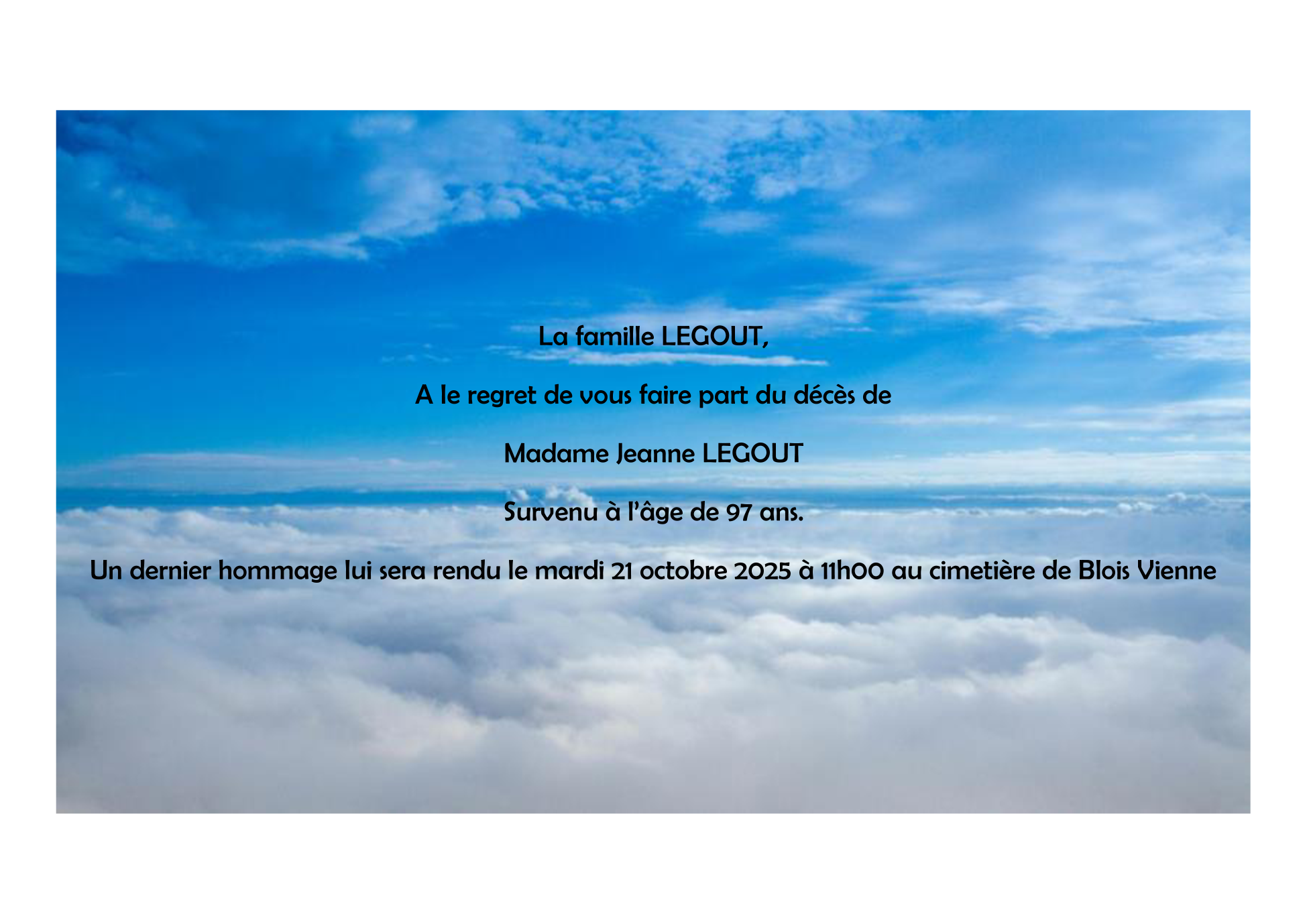 Cet espace « condoléances » est dédié à la mémoire de Madame Jeanne LEGOUT née COURTOIS.