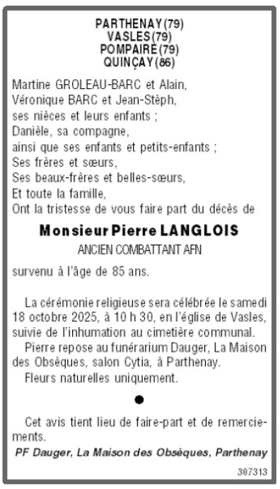 Cet espace « condoléances » est dédié à la mémoire de Monsieur Pierre LANGLOIS.