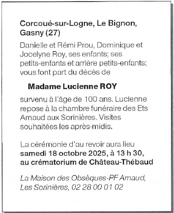 Cet espace « condoléances » est dédié à la mémoire de Madame Lucienne ROY née LEBRETON.
