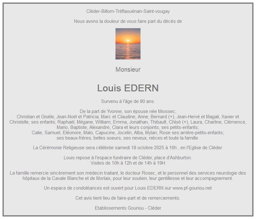Cet espace « condoléances » est dédié à la mémoire de Monsieur Louis EDERN.